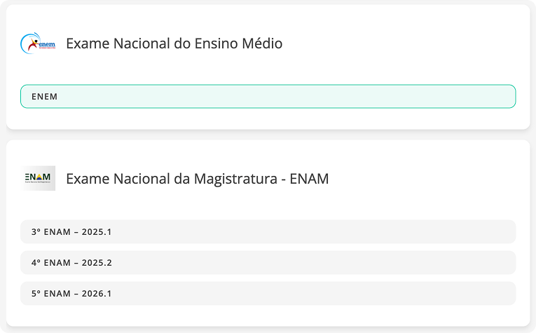 Selecione o concurso, vestibular ou exame, ou monte seu plano personalizado. Todas as matérias são carregadas de forma verticalizada.