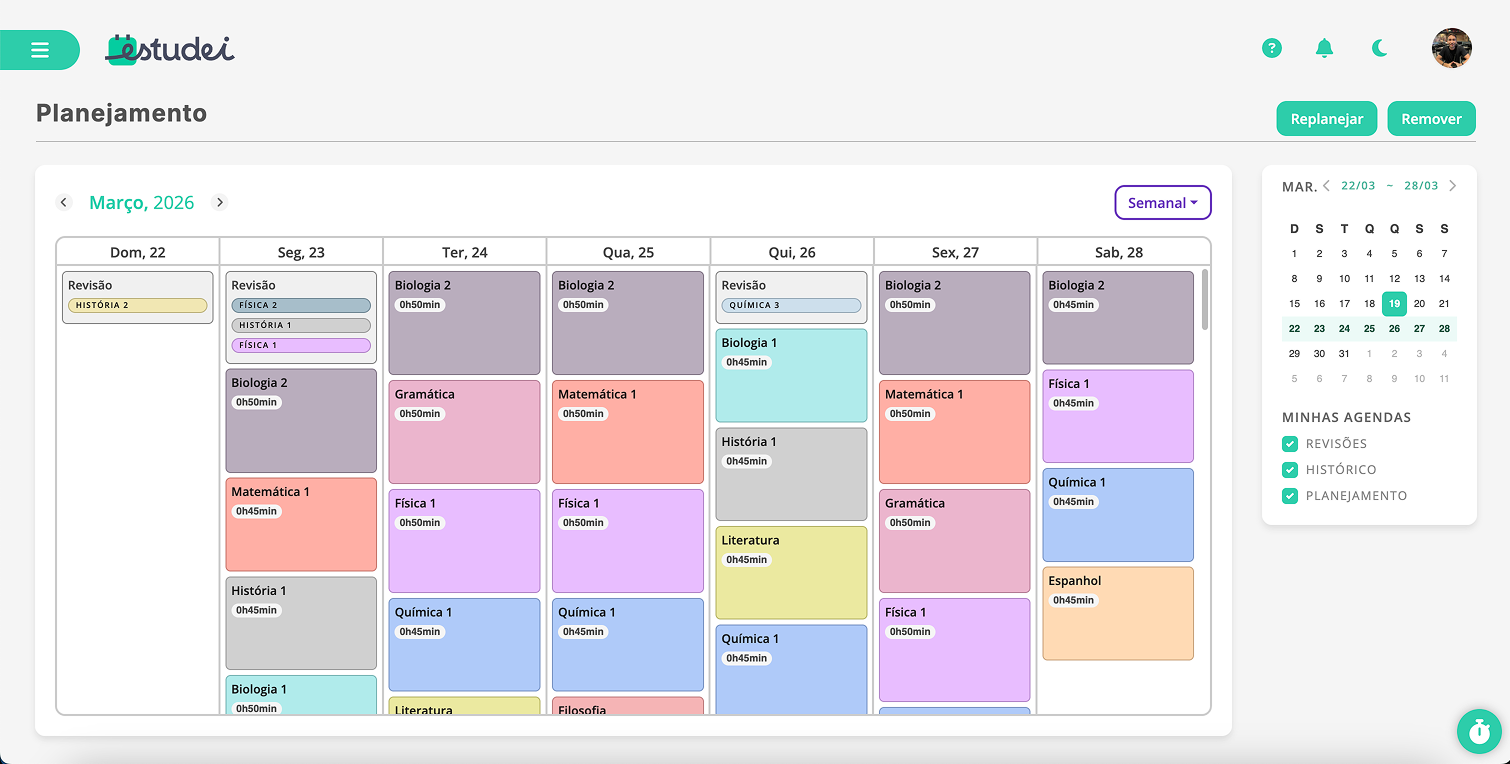 - Organiza automaticamente seu quadro semanal de tarefas e revisões