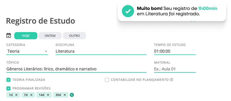 Use o cronômetro no app ou no navegador para registrar horas líquidas e categorizar cada sessão (teoria, questões, revisão).