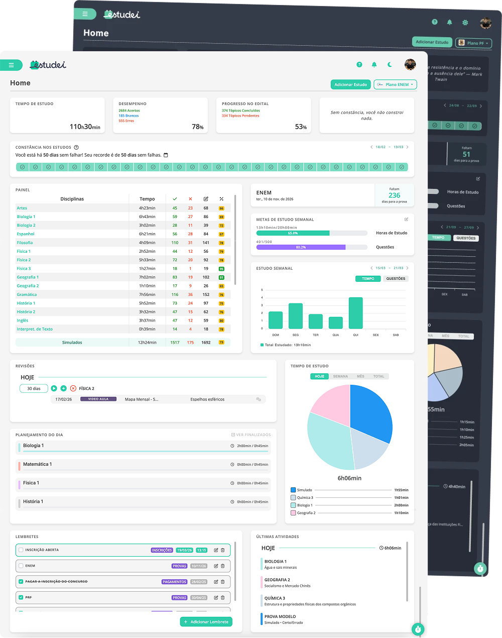 Planejamento automático, revisões programadas, estatísticas em tempo real e muito mais para transformar sua rotina de estudos.