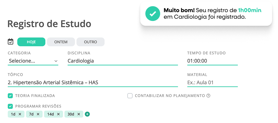 Use o cronômetro no app ou no navegador para registrar horas líquidas e categorizar cada sessão (teoria, questões, revisão).