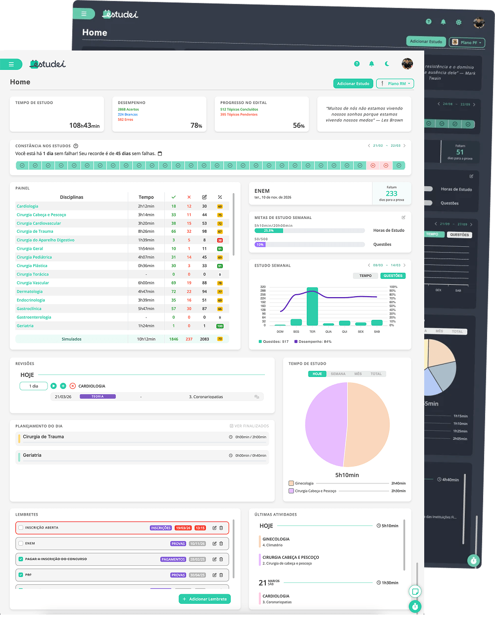 Planejamento automático, revisões programadas, estatísticas em tempo real e muito mais para transformar sua rotina de estudos.